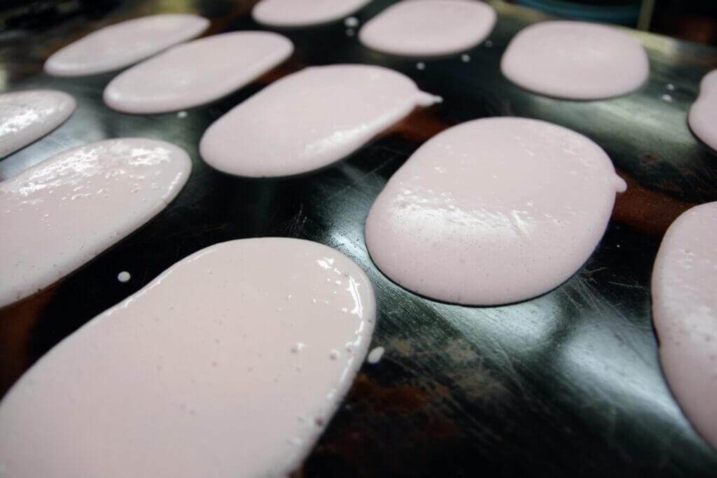 - 弱く熱した平鍋に薄く油を塗り、⑤を長さ約15㎝、幅約5cmに伸ばして焼きます。