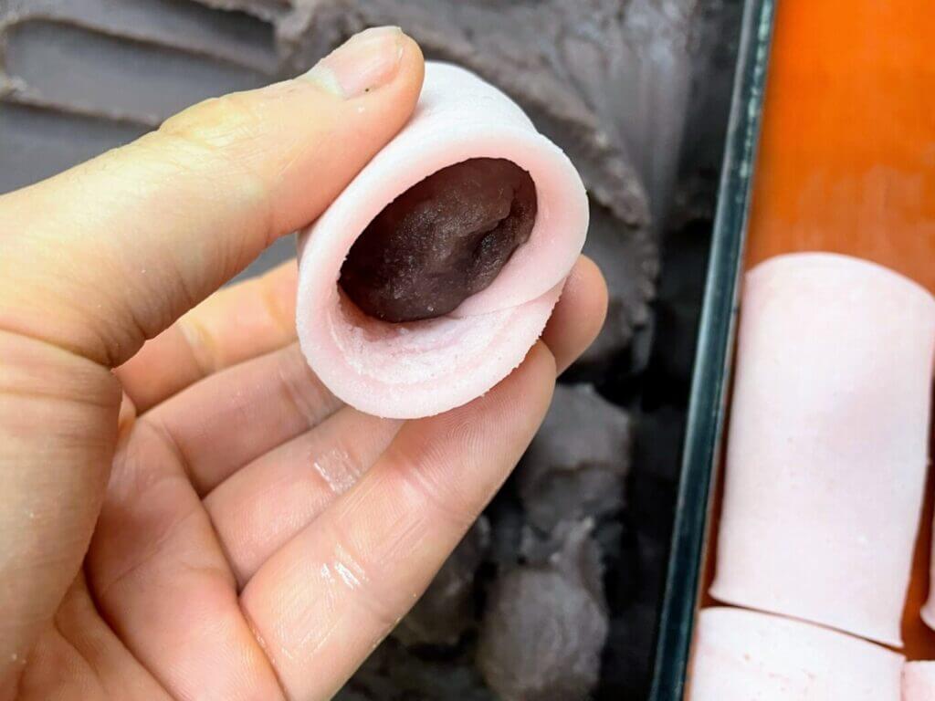 - 手に水をつけ③をのせ、熱いうちに指先で軽く広げてあん玉をのせて包みます。