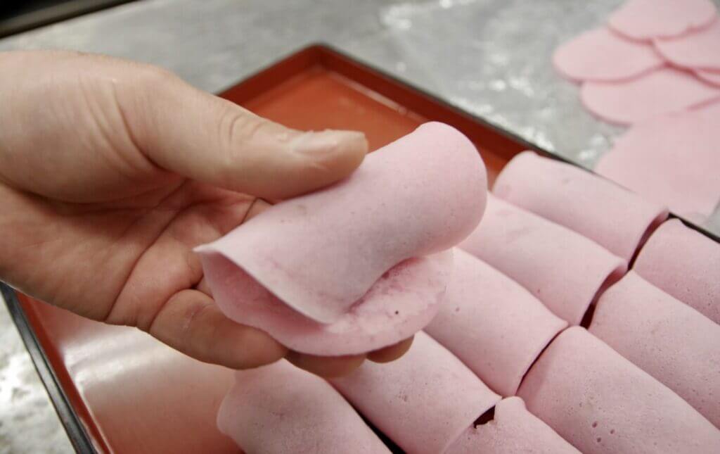 その上に餡を乗せ、手で転がしながら巻きます。 - 桜の葉の塩漬けで、巻き終わりと桜の葉の葉先が合うようにくるみ、完成です。