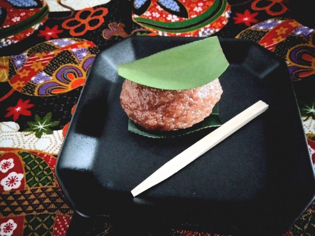 肉桂で色付けされた餡入りの餅の上下を、緑鮮やかな椿の葉で挟んでいる形が多くみられます。