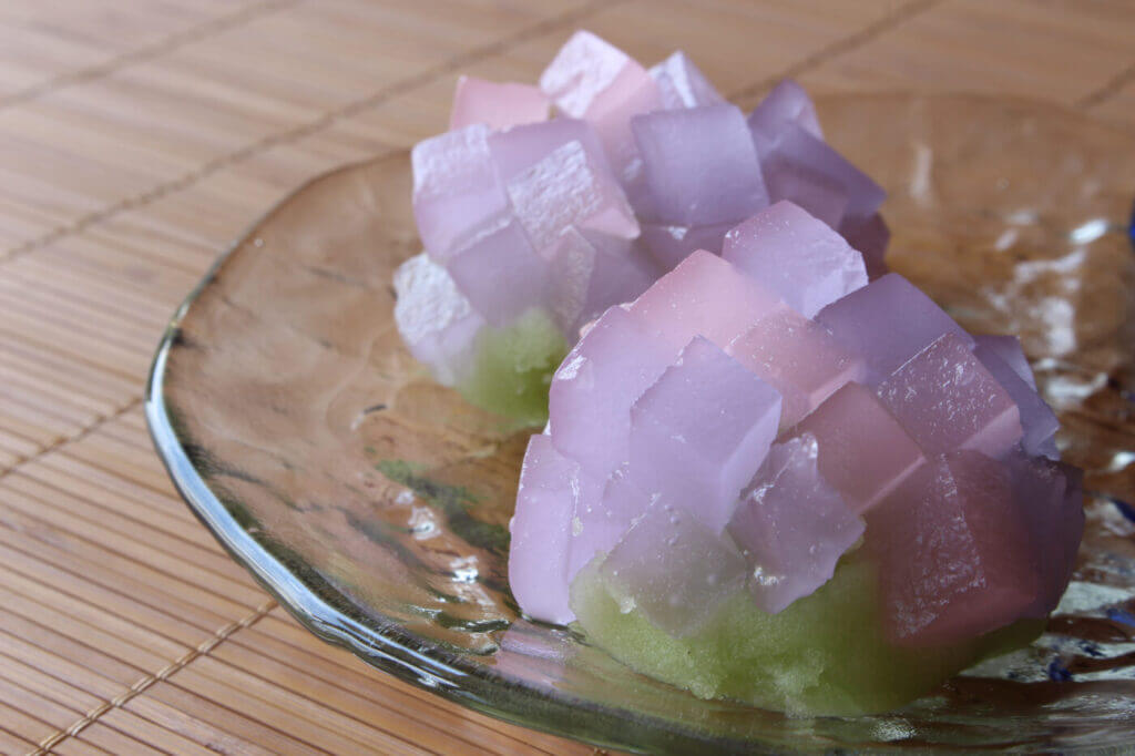 和菓子で表現される紫陽花は、錦玉羹など透明感のある食材を紫色や青色に染め、
