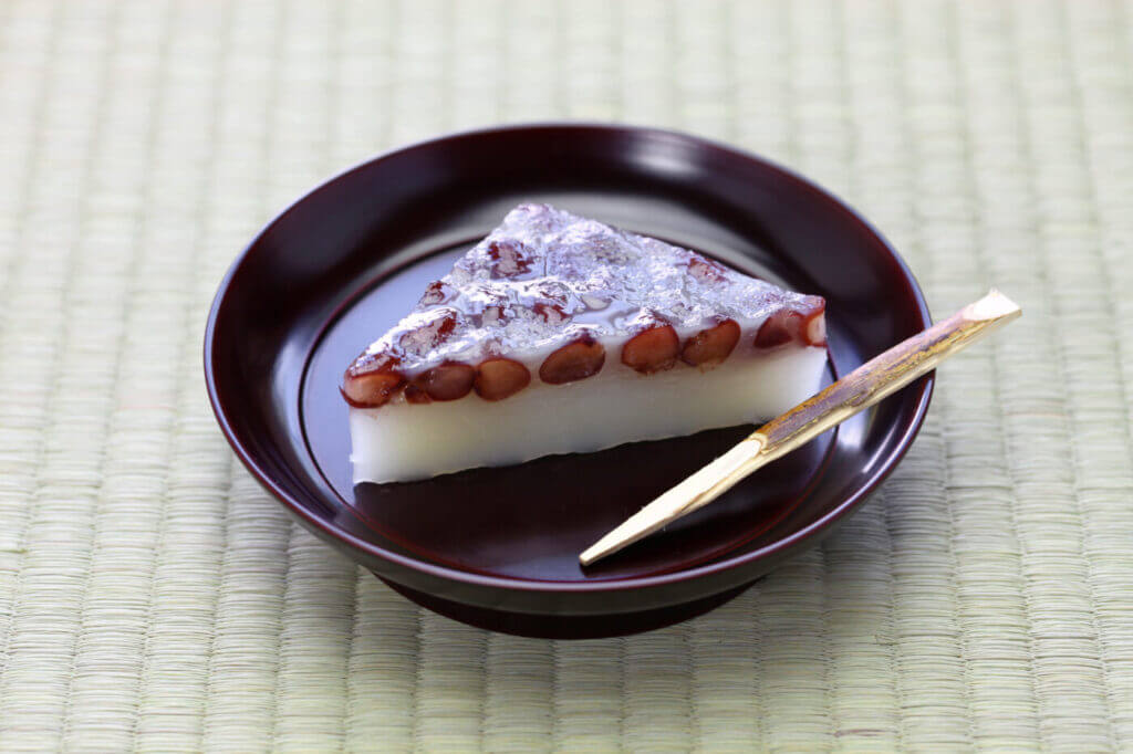 三角形の乳白色の生地の上に、蜜漬けした小豆を敷き詰めたものを水無月といいます。