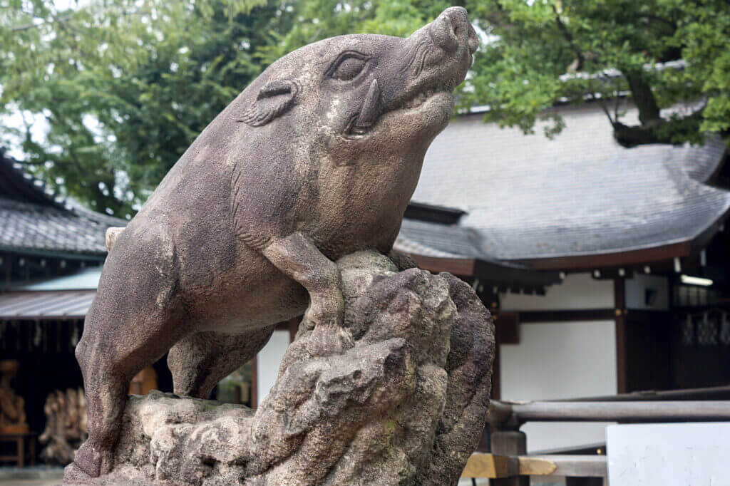この神社は、狛犬ではなく、狛猪がいることで有名です。