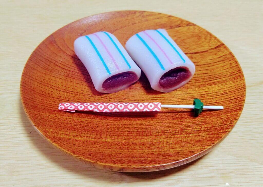 餡を包んだ白餅に蒙古軍の旗印である青・赤・青の線を施し、弓の弦で切り、神前に供えたのが始まりと言われています。